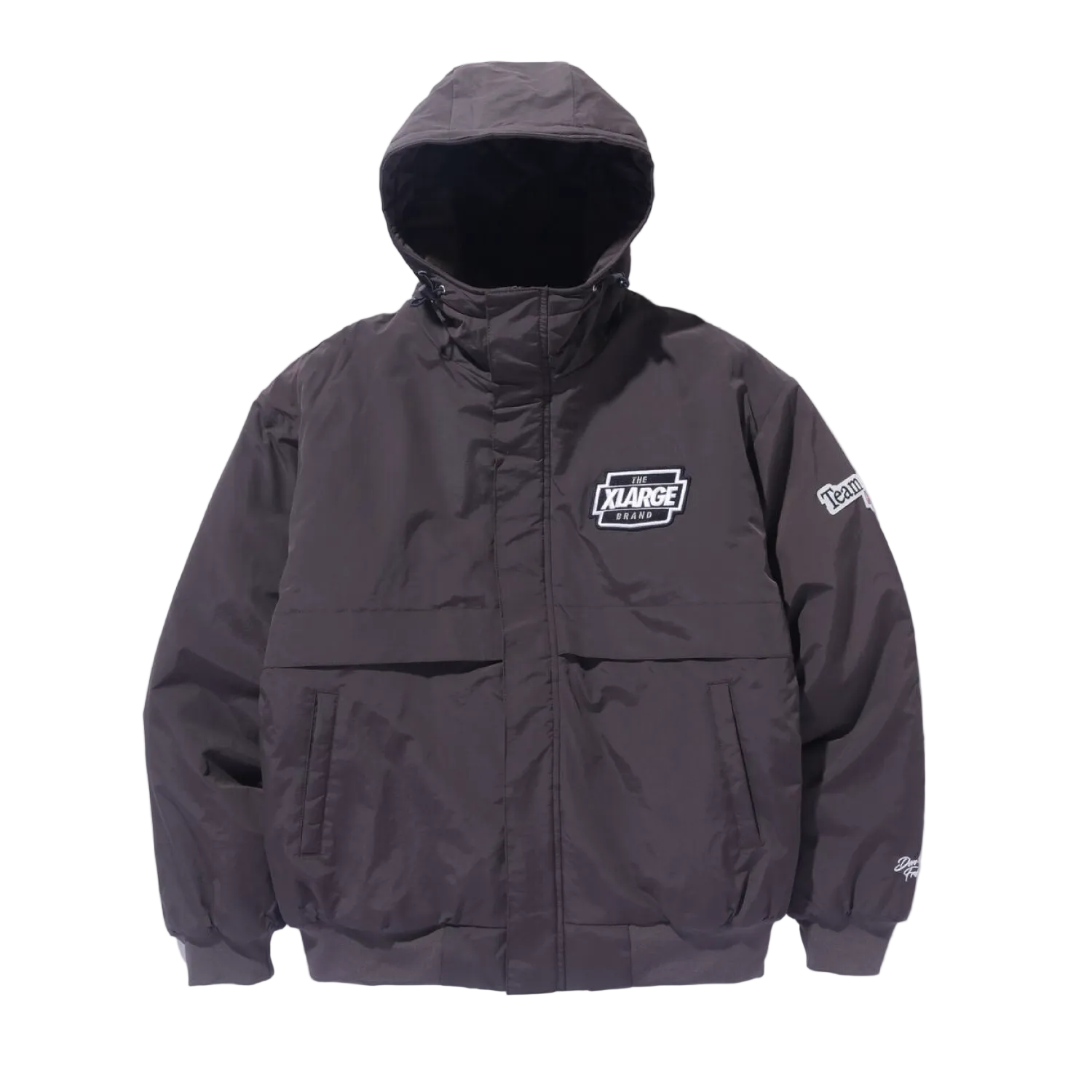 Cuenta con capucha ajustable con cordón, puños y dobladillo acanalados para un ajuste cómodo, cierre frontal con cremallera y broches a presión, y múltiples detalles con el logo de XLARGE®.